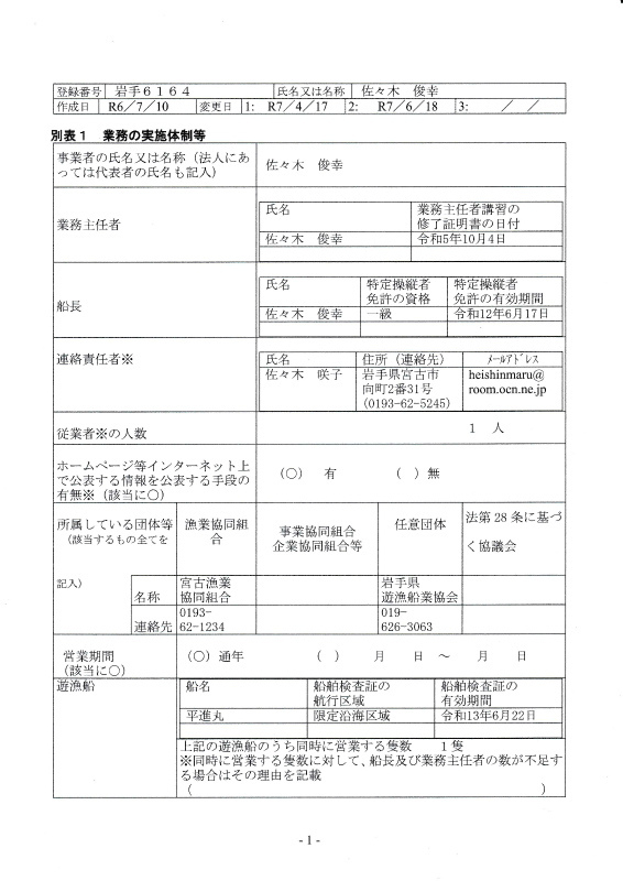平進丸『遊漁船業者登録票』